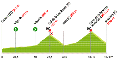 Das Peleton verlässt das Nachbarland Italien und kehrt wieder nach Frankreich zurück. Die Etappe von Cuneo nach Jausiers ist zwar “nur“ 157 Kilometer lang, aber dafür warten mit dem Col de la Lombarde (2.351 Meter, 21,5 Km, durchschnittlich 6,9 %) und dem Cime de la Bonette Restefond (2.802 Meter, 25,5 Km, 6,5 %) zwei Anstiege der „Horse Categorie“ auf die verbliebenen 153 Fahrer.